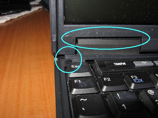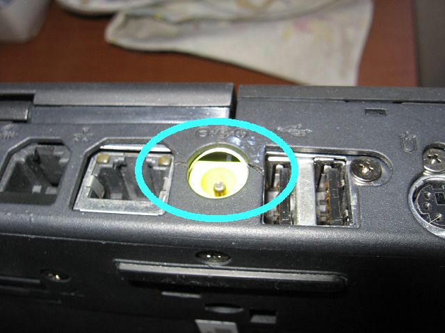 Back panel of T23 showing damage around DC power jack (original image 1.2MB):