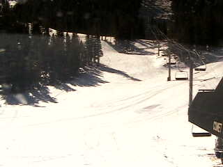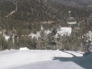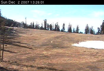 East Peak looks normal, but all of the snow you see there is man-made. Above, is the Tram Cam (elevation about 8000') which looks down on the Gunbarrel run. Again, all of the snow there is being made by the snow guns you see running. To the left, Dipper Cam is at the top of the East Peak lift. Some of the snow here is natural; most is not. |